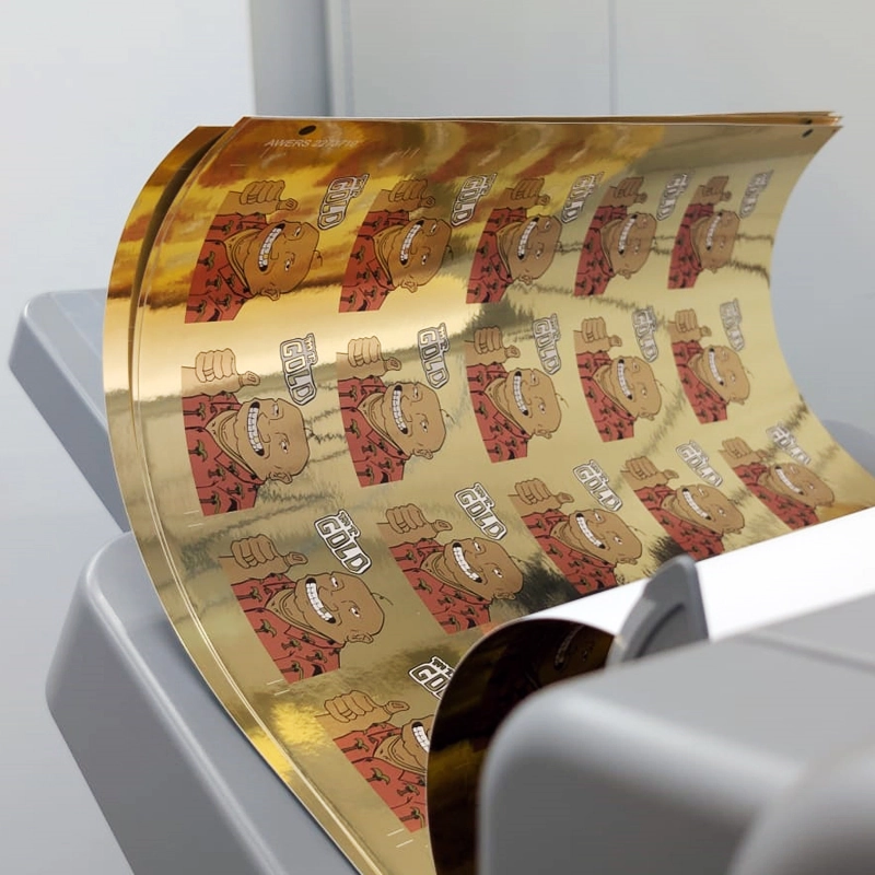 Debido a la naturaleza del sustrato metalizado, la impresión CMYK se realiza directamente sobre la superficie de la película, lo que da a los colores un efecto metálico que refleja la luz. No se utiliza impresión blanca debajo de los colores CMYK, por lo que los colores obtenidos difieren de los impresos en papel blanco: son más transparentes y reaccionan al color y brillo de la película.